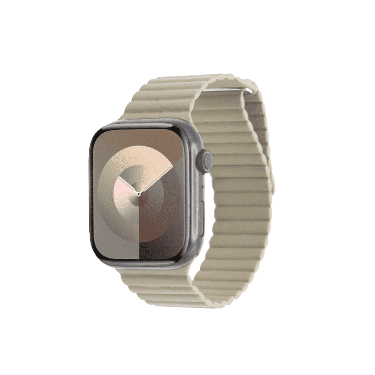 El sistema de sujeción magnética asegura que la correa se ajuste de manera firme y precisa a tu muñeca, proporcionando un nivel de comodidad y seguridad superior. La flexibilidad del material, que podría ser de un compuesto suave y duradero, ofrece un ajuste adaptable que se siente natural durante todo el día, permitiendo que tu Apple Watch se mantenga en su lugar sin deslizamientos.